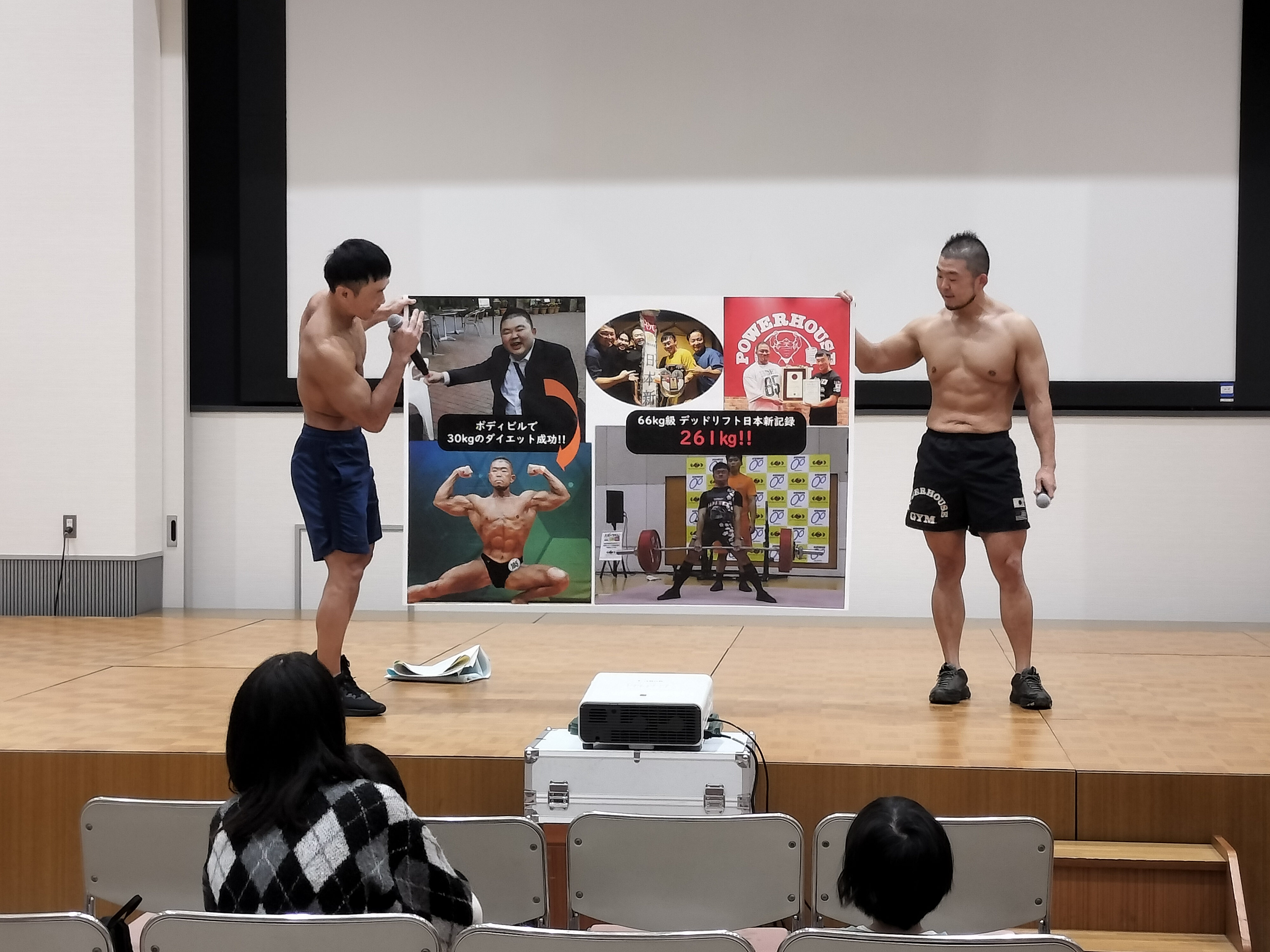 大ホールのステージでは「マッチョ体操」のパフォーマンスを行いました。パワーリフティング日本代表の伊東優太選手に加え今年はサポートメンバーの近藤さんも参加。