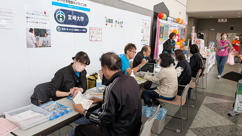 健康体験では、腕につけた電極で簡単に心電図が測れる「心電図モニターチェック」と歩数増加を勧める「#あるこうやみやざき」のコーナーを実施。