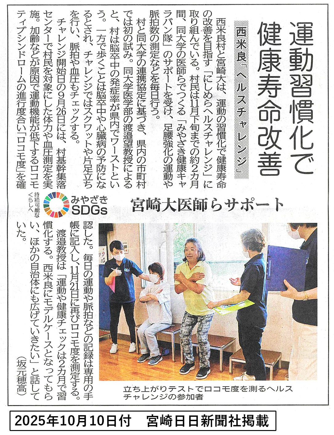 2025年10月10日発刊の宮崎日日新聞に西米良村健康福祉課と宮崎大学が共同で取り組んでいる「にしめらヘルスチャレンジ」についての記事が掲載されました。