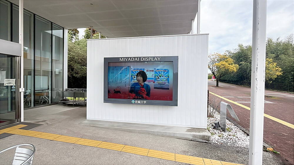 宮崎大学木花キャンパス地域デザイン棟液晶ディスプレイで「あるこうや」の動画を流しています。