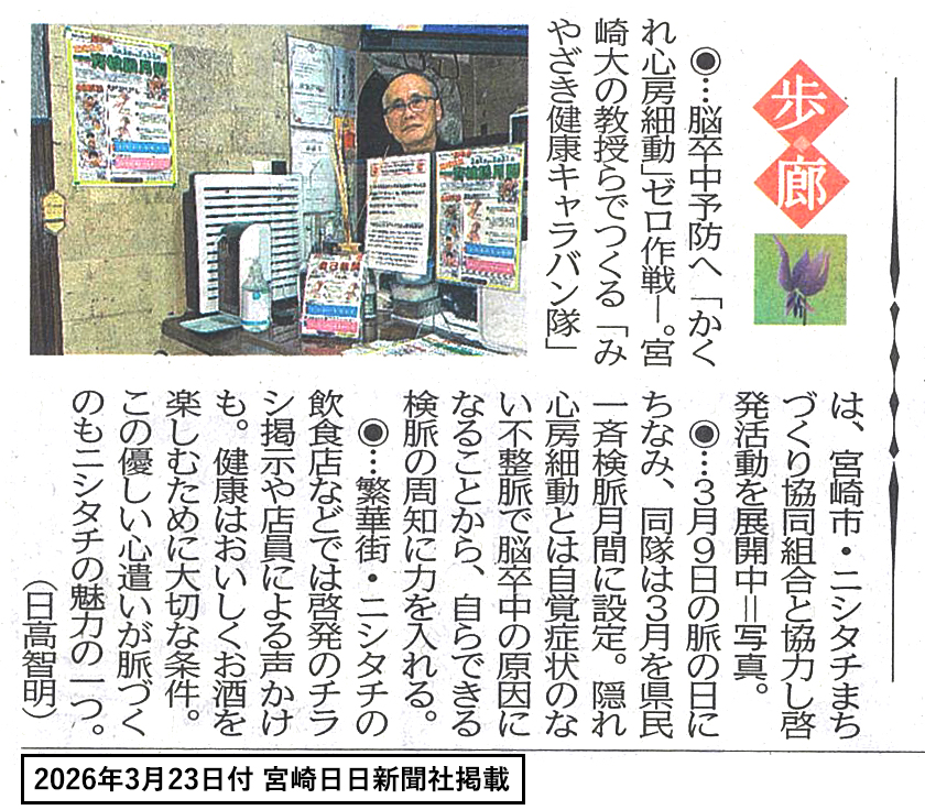 2026年3月23日発刊の宮崎日日新聞にキャラバン隊による取り組み「宮崎県民一斉検脈月間」についての記事が掲載されました。