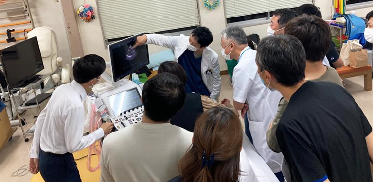 会場の桑原記念病院会議室は立ち見で溢れ、続くハンズオンを行ったリハビリ室では2台の最新超音波装置を用いて心エコー専門技師による指導で基本断面の描出を体験していただいたり、日ごろ心エコー検査をされている皆さんから沢山質問をいただいてお話ししたりと大盛況で、とても充実した楽しい時間となりました。