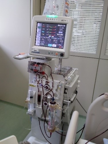 血液浄化療法部では、血液透析やアフェレーシス治療(血漿交換、血漿吸着など)施行時の機器操作および患者管理を中心に、監視装置や水処理装置等の周辺機器の保守管理を行なっています。