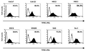 TFRC(transferrin receptor C)は細胞における鉄取り込み作用において重要な機能を有しています。特に癌細胞においては、細胞自身の増殖能を維持するために多くの鉄が必要となるため、TFRCの発現も多くなるといわれています。実際に当研究室においてTFRCの発現を口腔癌細胞において検討したところ、やはりTFRC発現の増加が確認できました。
