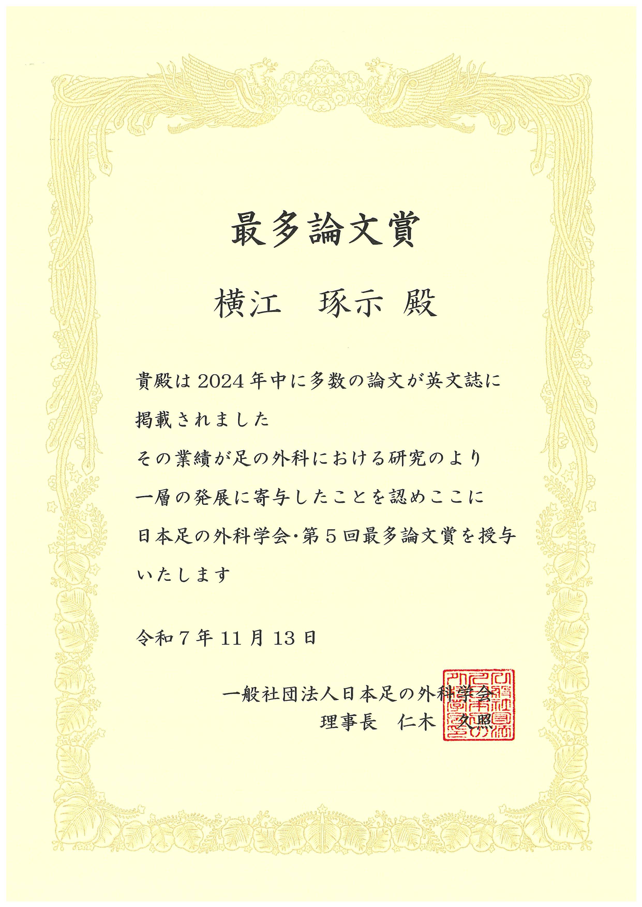 横江琢示助教が、一般社団法人日本足の外科学会において、「第5回日本足の外科学会・最多論文賞」を受賞されました。