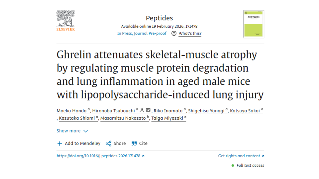 本研究は、老齢マウスを用いた検討により、肺炎などの強い炎症によって起こる筋肉量の減少に対し、グレリンが予防効果を示す可能性を明らかにしました。グレリンは、筋肉の分解を抑え、炎症や酸化ストレスを軽減することで筋量・筋力の低...