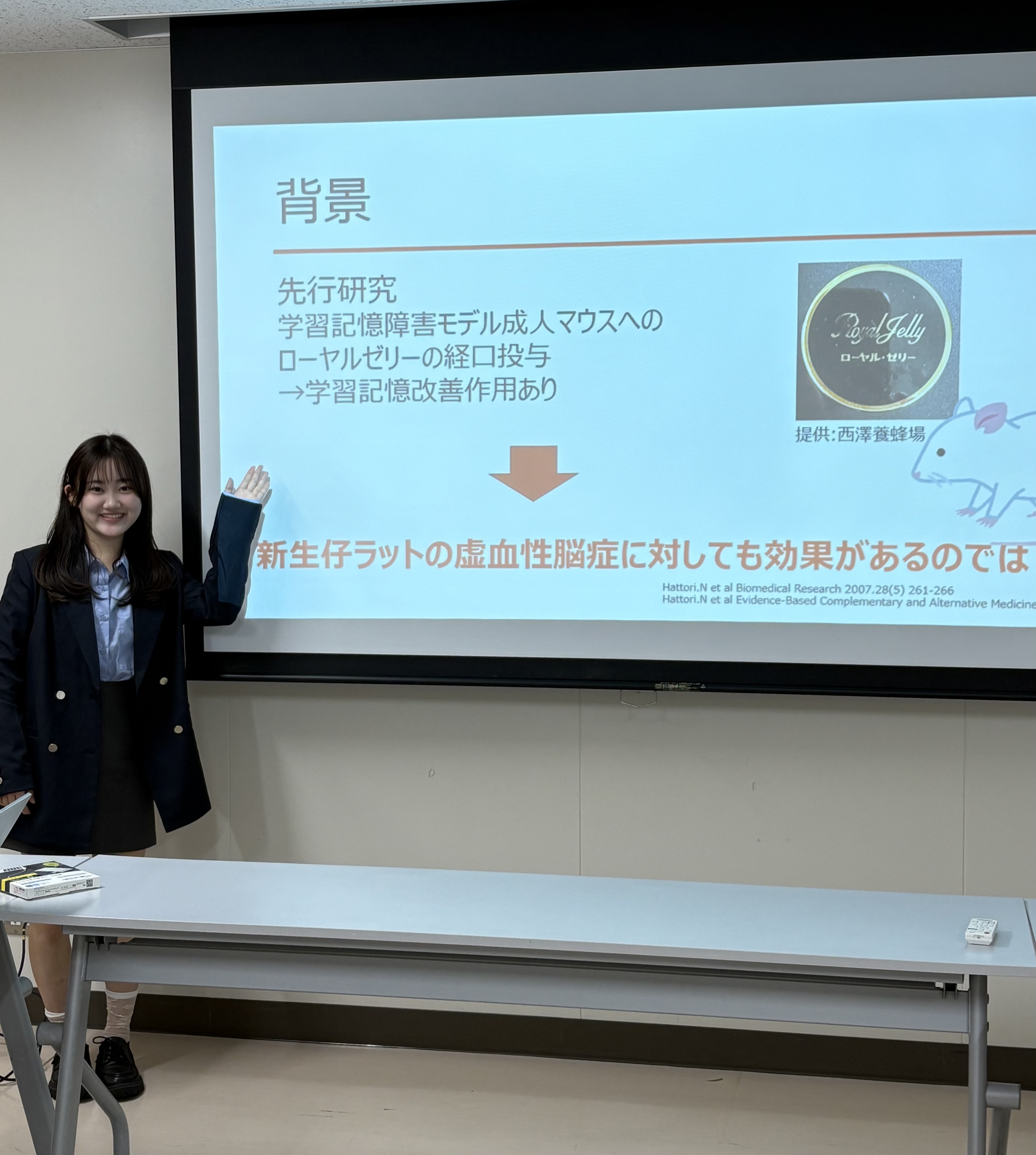 宮崎大学産婦人科ではこの研究に約30年前から継続して取り組み、今回山本菜々美さん・井形唯音さんには治療侵襲の少ない治療法としてのローヤルゼリーが脳梗塞を着目する事を応用し、『ローヤルゼリーを用いた低酸素虚血性脳症の改善効果』に関する研究に取り組んで頂きました。