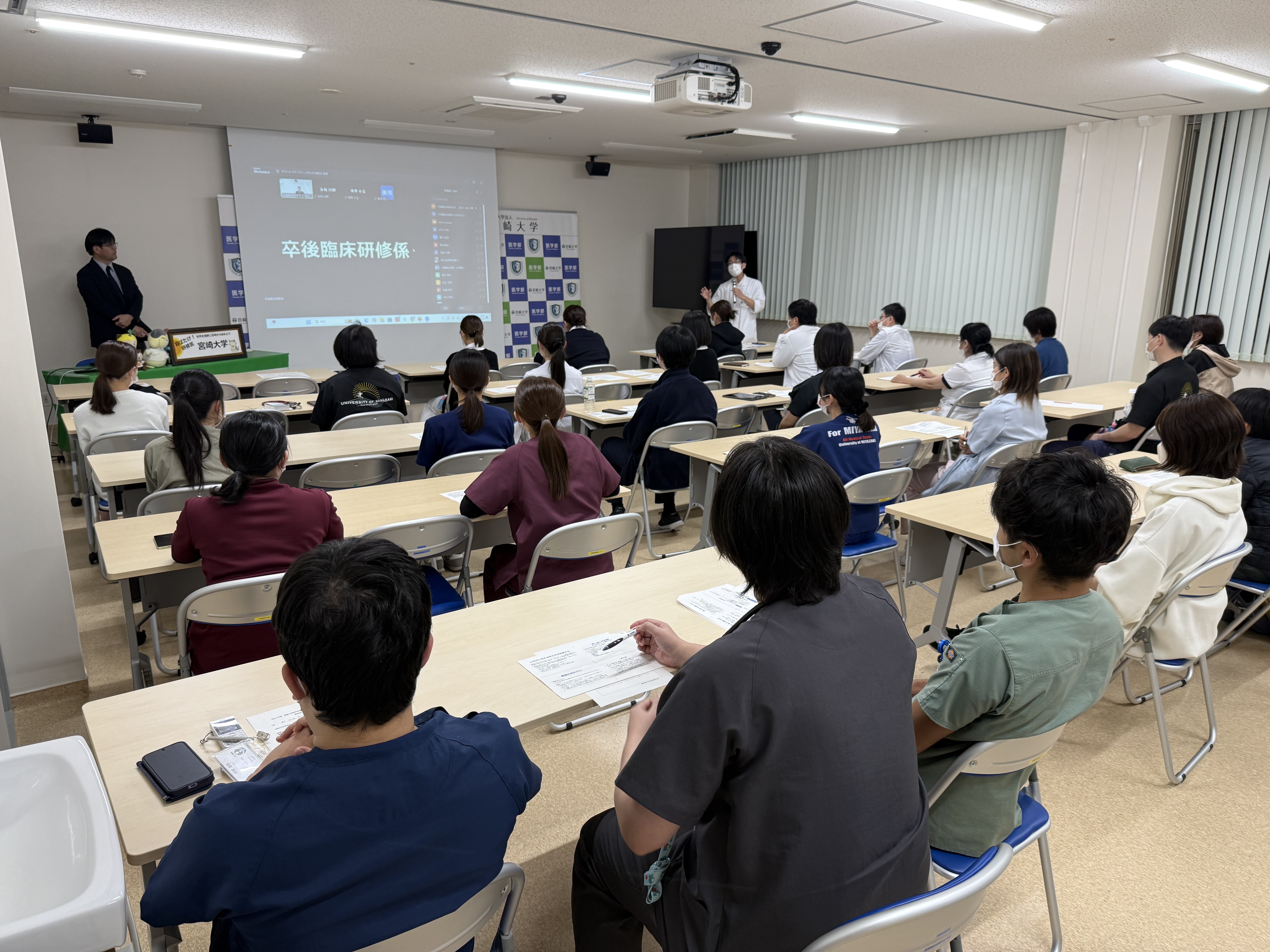 本講義は貴重な学習機会であることから、研修医に加えて指導医クラスの医師や看護師の皆様にも聴講を開放し、卒後臨床研修センターセミナー室には、研修医・指導医・看護師など計29名が参加しました。院内研修中の研修医には対面参加を基本としつつ、院外研修中の研修医や県内他基幹型病院の研修医に向けては、Zoomによる視聴機会を提供しました。