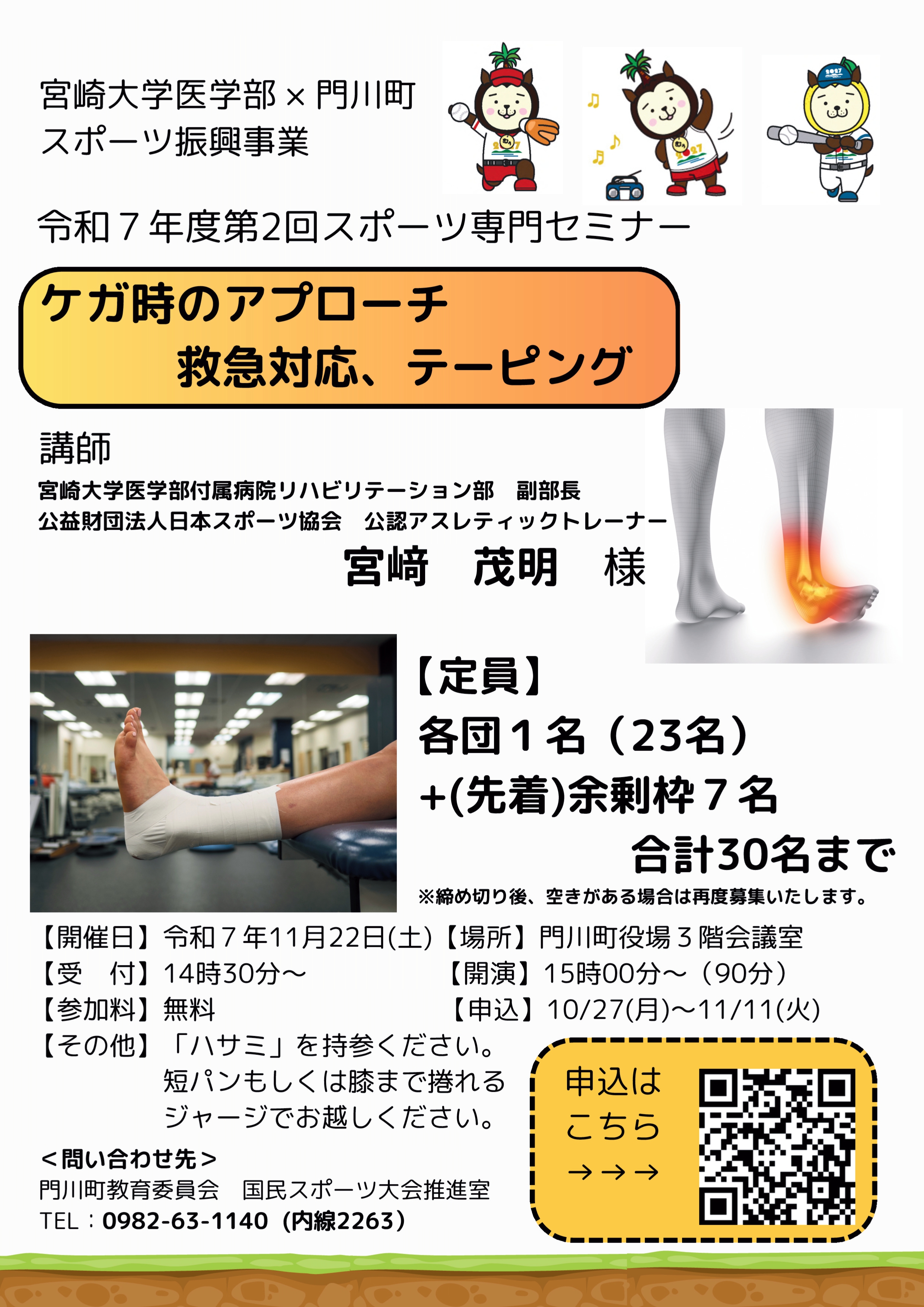 門川町主催「令和7年度 第2回スポーツ専門セミナー」にて、宮﨑 茂明 リハビリテーション部副部長が「ケガ時のアプローチ 救急対応、テーピング」の講演をおこないました。