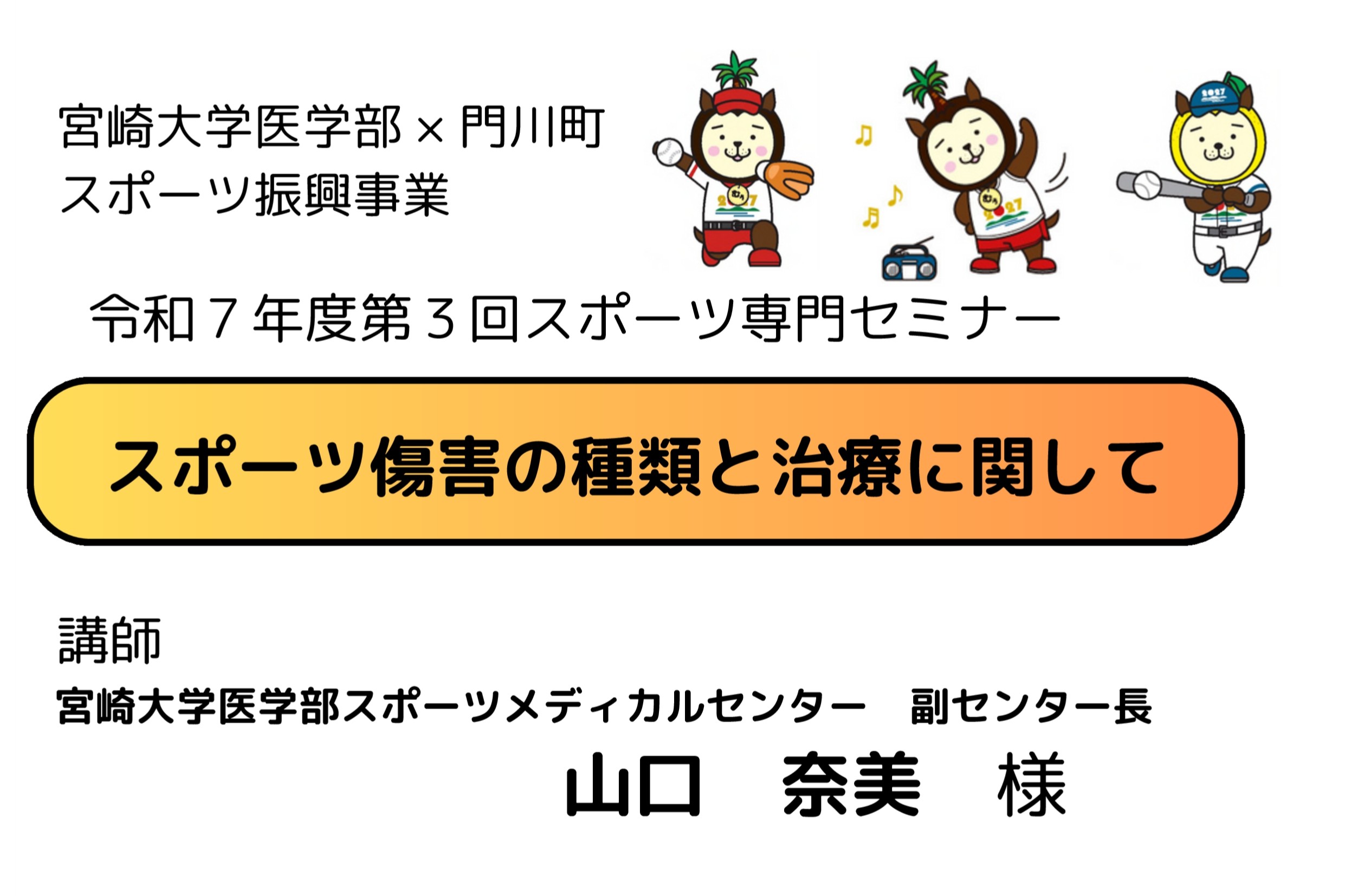 2026年3月23日 / Last updated : 2026年4月1日 更新担当者 お知らせ 令和7年度 第3回スポーツ専門セミナー ■実施日:3月21日(土) 門川町主催「令和7年度 第3回スポーツ専門セミナー」にて、山口 奈美 スポーツメディカルセンター 副センター長 が「スポーツ障害の種類と治療に関して」の講演をおこないました。